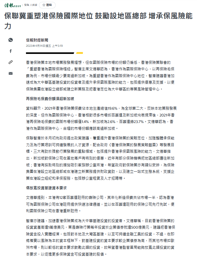 保聯冀重塑港保險國際地位 鼓勵設地區總部 增承保風險能力